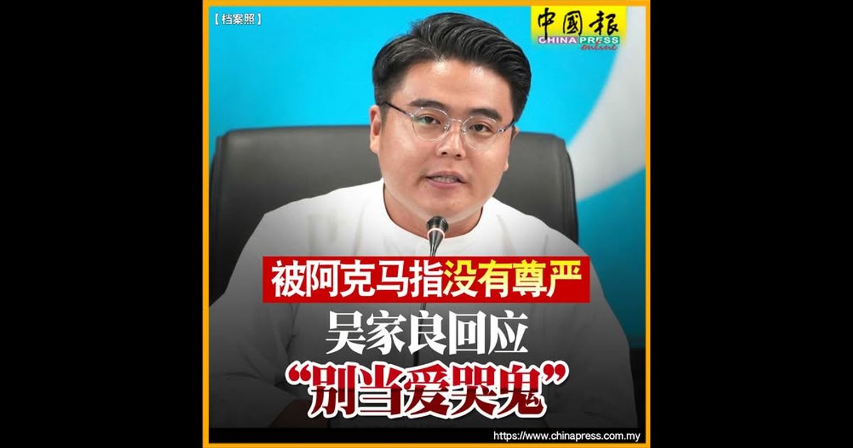 吴家良在面子书贴文回击阿克马的没有尊严论,要求阿克马当个男人,“不要当个爱哭鬼”。