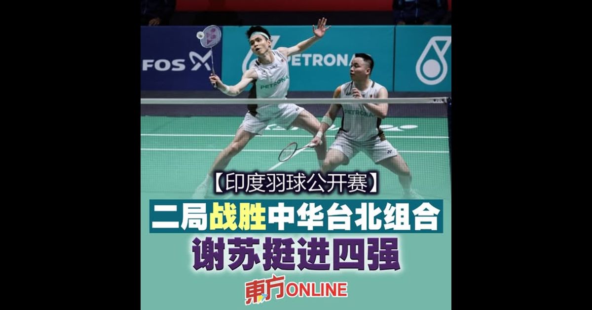 (新德里16日讯)印度羽球公开赛(超级750赛)今日展开8强对局,大马“谢苏组合”(谢定峰/苏伟译)迎战昨日击退“飞汀组合”(吴世飞/诺伊祖汀)的中华台北男双——杨博轩/李哲辉。双方此前4度交手,皆由谢苏组合取胜。在今天的对局中,谢苏组合以21-19、21-14取胜,挺进4强。