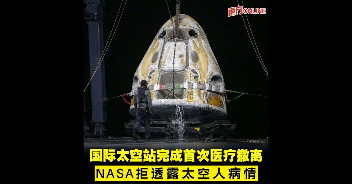 (华盛顿16日讯)国际太空站4名太空人周四回到地球,溅落在太平洋,这是国际太空站史上首次进行医疗撤离。至于出现生病的太空人身份和状况,美国太空总署(NASA)不愿透露太多。