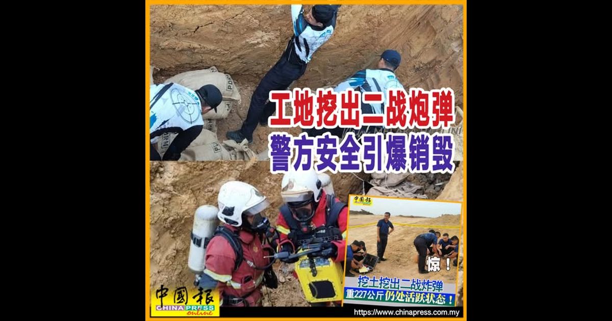 (马六甲16日讯)野新建筑工地早前被挖出一枚相信是第二次世界大战遗留下来的炮弹,野新警方在获得消拯局协助下,安全引爆销毁该枚重达227公斤的炮弹,整个行动过程中未发生任何意外,也没有造成公共财物损毁。