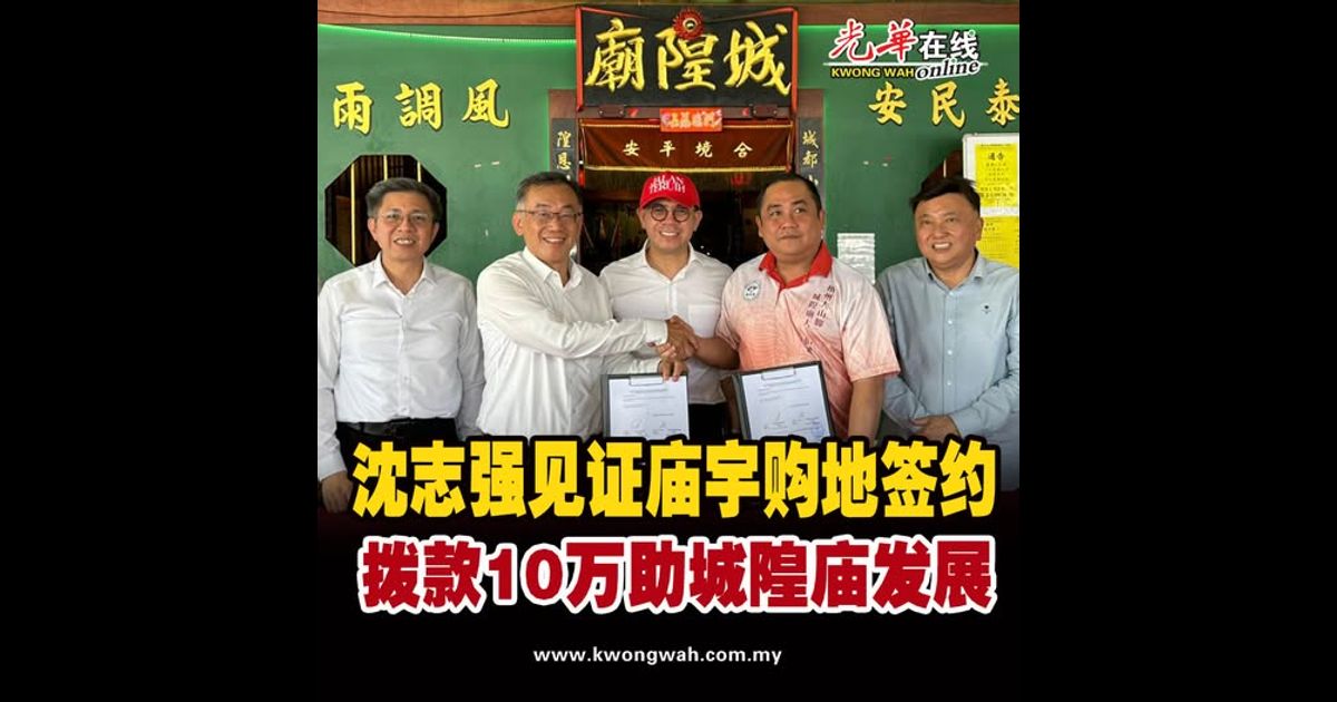 企业发展与合作社部长沈志强出席大山脚城隍庙大二伯爷理庙宇地皮购置合约签署暨见证仪式,并宣布拨款10万令吉予该庙宇购地,扩大现有规模。