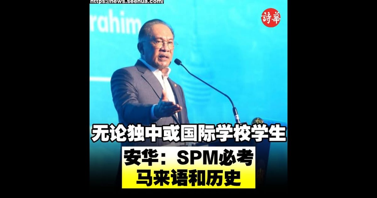 (布城20日讯)首相拿督斯里安华表示,无论是在独中、国际学校还是宗教学校就读的大马学生,必须在大马教育文凭(SPM)中报考马来语和历史科目。