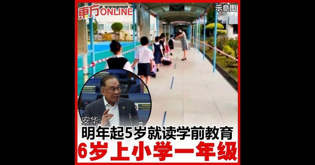 (布城20日讯)首相拿督斯里安华宣布,从明年起,将学前教育的入学年龄调整为5岁入学,一年级新生的入学年龄则为6岁。