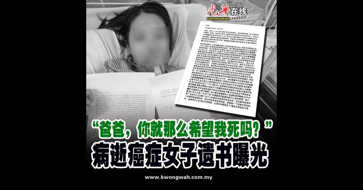 据了解,撰写该封遗书者是年仅22岁的王姓氏女子,她于2026年1月18日凌晨,在诗巫医院 因癌症病逝。这封遗书是由王氏女子的妹妹,透过脸书公诸于世。根据内容,王氏女子指称生前与其妹妹,长期遭受父亲与继母的身体及精神对待不当。