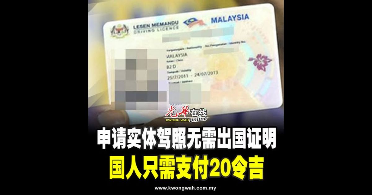 交通部宣布,1月23日开始,国人申请实体驾照(LMM)将无需出示任何出国证明,只需支付20令吉就可取得实体驾照,至于非公民则需支付100令吉。