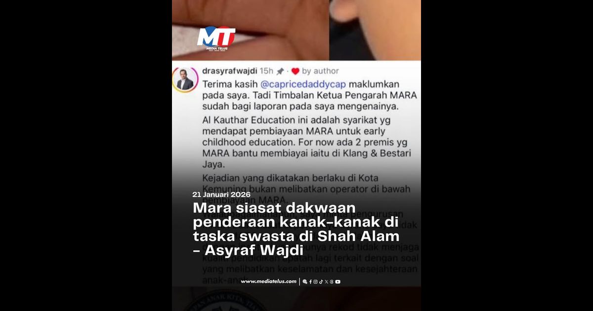 KUALA LUMPUR 21 Jan – Majlis Amanah Rakyat (Mara) memberi jaminan akan menjalankan siasatan menyeluruh susulan dakwaan penderaan kanak-kanak membabitkan sebuah taska swasta di Shah Alam yang mencetuskan kemarahan orang ramai selepas rakaman kejadian tular di media sosial sejak semalam.
