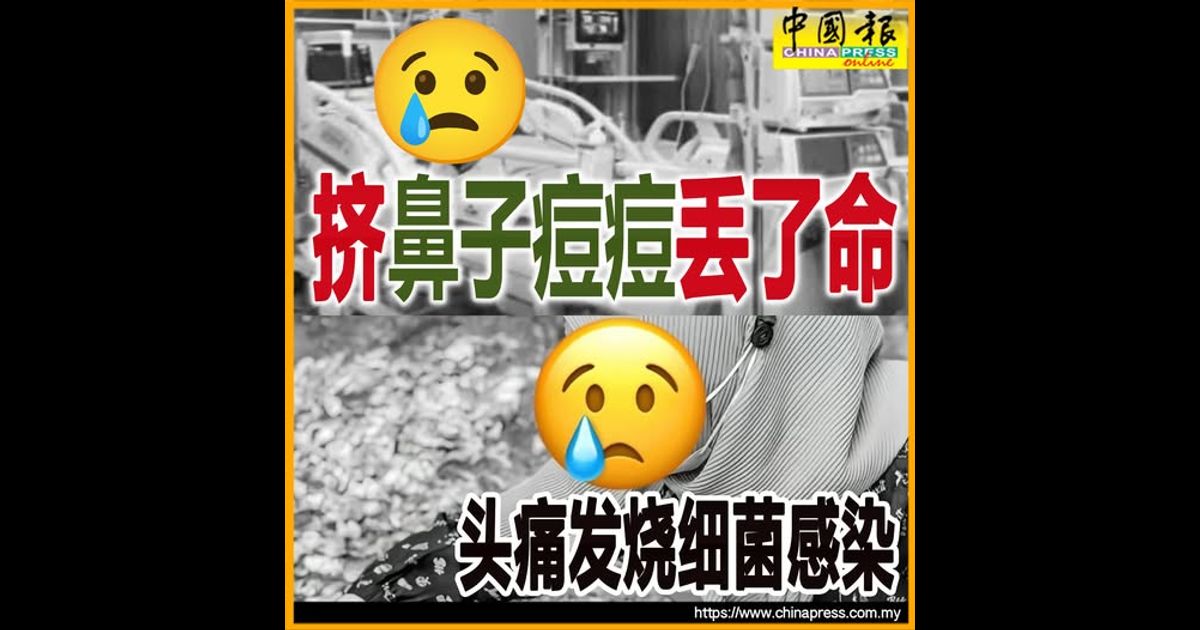 (吉隆坡23日讯)挤压痘痘竟能致命!一名妻子原想替丈夫挤出鼻子上的痘痘,以缓解其疼痛,不料这一行为导致细菌感染,丈夫因此不幸身亡。