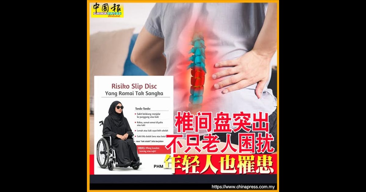 大马公共卫生专页(PHM)说,椎间盘突出并非老人专有疾病,因这也可能发生在20、30多岁的人身上,尤其那些长时间久坐、搬重物、曾经摔倒或发生小意外,及多年忍受背痛却没有检查的人。