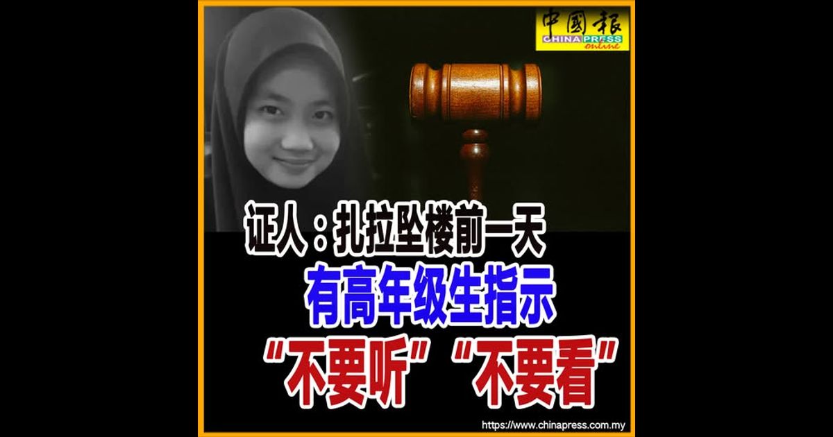 (亚庇23日讯)13岁女学生扎拉凯丽娜坠楼亡前一天,有高年级学生指示宿舍内学生“不要听”、“不要看”。