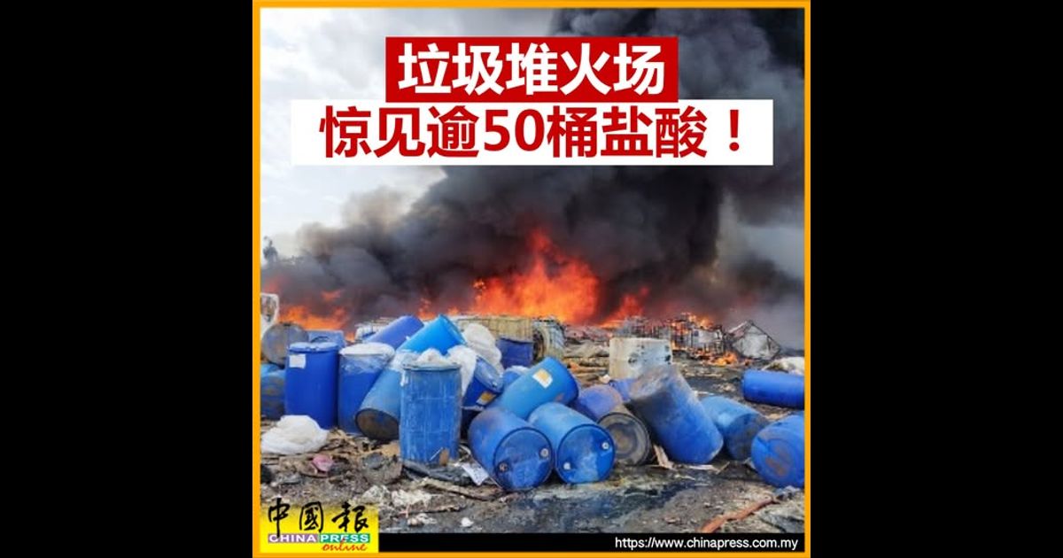 (八打灵再也24日讯)垃圾堆起火燃烧,消防员到场灌救时,惊觉火场内竟放有超过50桶,每桶容量达200公升的腐蚀性液体盐酸!