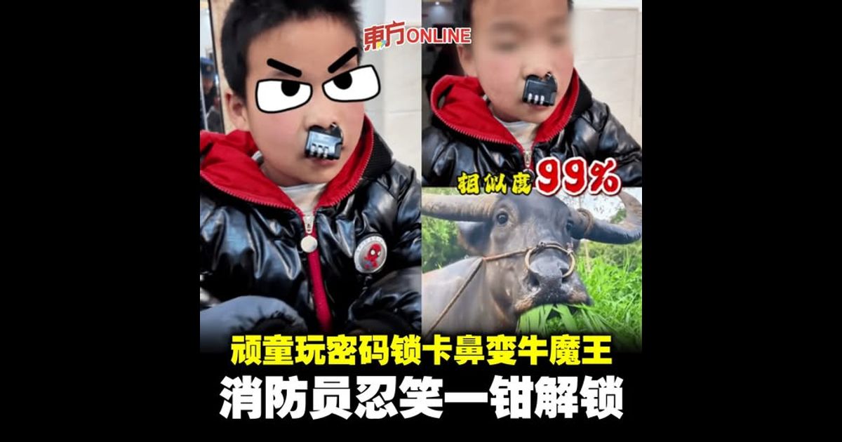 (怀化24日讯)中国湖南怀化发生一起令人啼笑皆非的意外,一名男童在玩耍时,一时兴起将手中的密码锁环往鼻梁上套,结果锁环卡死动弹不得,令他瞬间化身“牛魔王”,模样既滑稽又可怜。家长尝试各种方法都无法脱困,最后只好带著这名小小“牛魔王”奔向消防队求援。