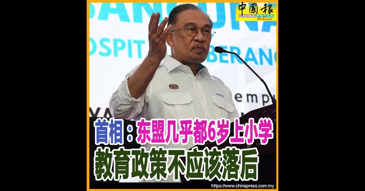 (北海24日讯)首相拿督斯里安华说,放眼东盟国家,几乎所有国家的儿童都是6岁念小学,因此我国教育政策上不应该继续落后。