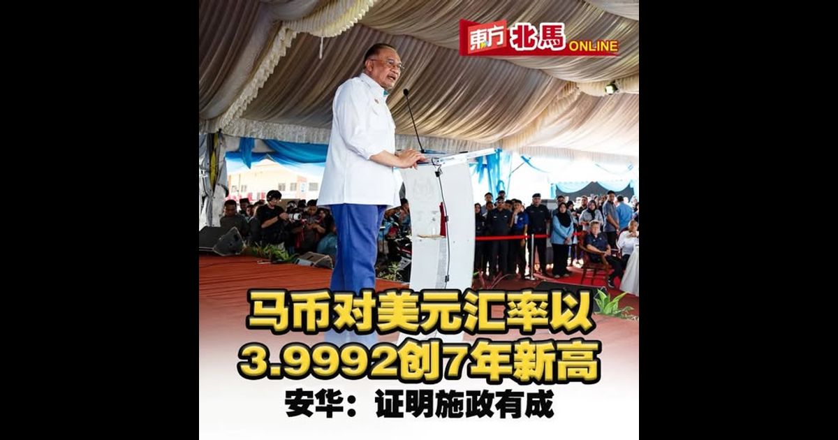 (北海24日讯)首相兼财政部长拿督斯里安华强调,马币对美元汇率近期突破心理关口,以3.9992创下近7年来新高,成为亚洲表现最强的货币之一,显示外界对我国政治稳定与经济前景充满信心。