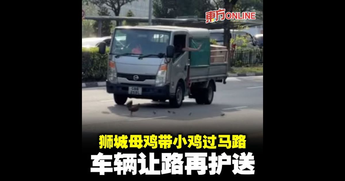 (新加坡25日讯)新加坡汤申路上段上演暖心的一幕,一只母鸡带著五只小鸡过马路时,车子见况立即让路,还护送它们回到人行道。