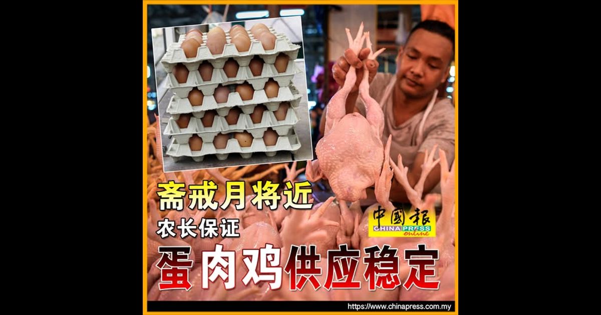 (吉隆坡26日讯)斋戒月将至,农业及粮食安全部长拿督斯里莫哈末沙布保证,本地市场肉鸡和鸡蛋供应稳定。