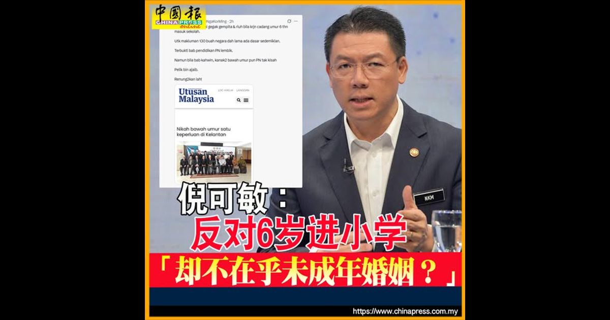 (吉隆坡27日讯)房屋及地方政府部长倪可敏质疑,国盟反对“6岁念小学一年级”政策,却毫不在意未成年婚姻课题,让人觉得非常奇怪。