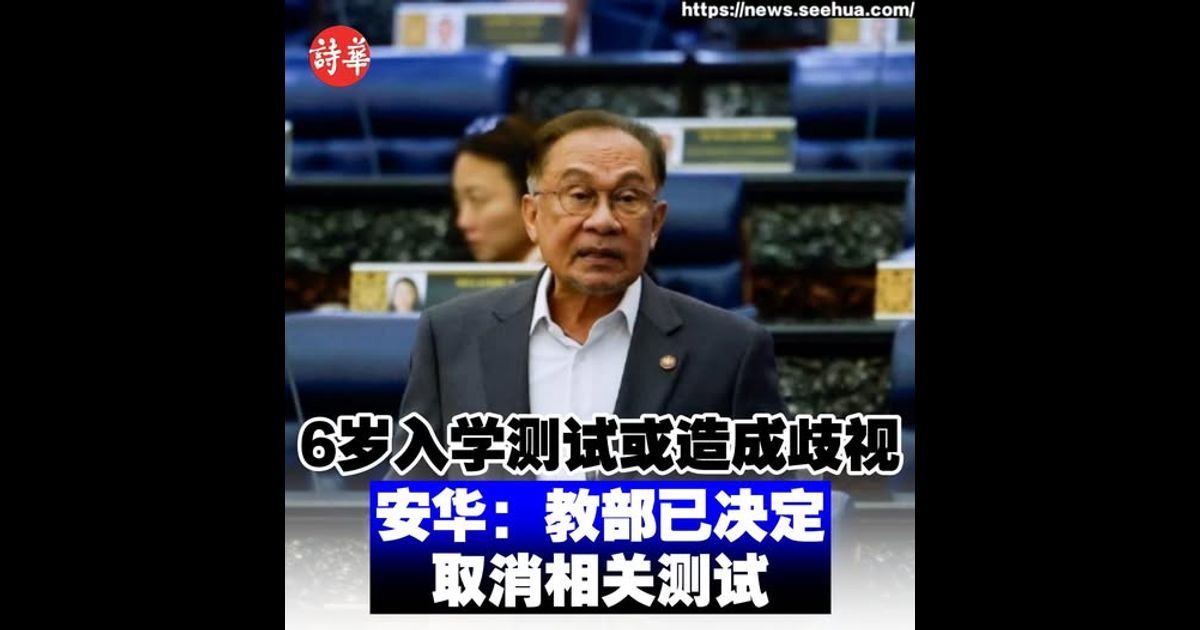 (吉隆坡27日讯)首相拿督斯里安华表示,政府考虑到对6岁儿童进行入读小学一年级的诊断性测试可能造成歧视问题,因此教育部已决定取消相关测试。