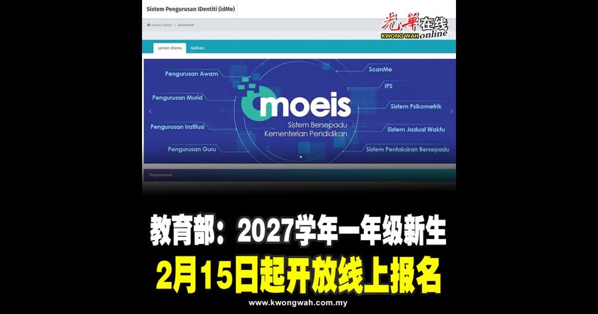 教育部宣布,2027学年一年级新生报名将于2026年2月15日至3月31日期间,以线上方式进行。家长可通过教育部综合系统(MOEIS),登入 https://idme.moe.gov.my办理相关手续。