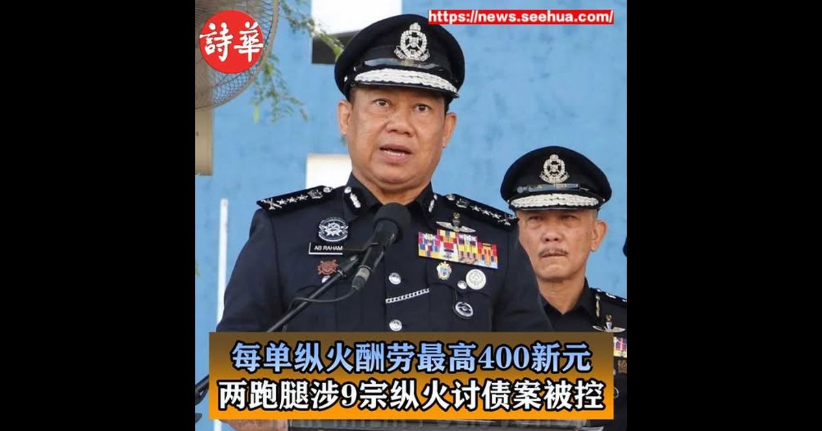 “初步调查显示,两名嫌犯当时正前往巫罗加什一处民宅地址,准备向受害者住家投掷汽油弹。警方深入调查后揭发,这两名嫌犯受雇于非法放贷集团(大耳窿),其干案手法是接收大耳窿指令后,前往指定地点进行纵火恐吓。每执行一次任务,两人可获得300至400新元酬劳。”
