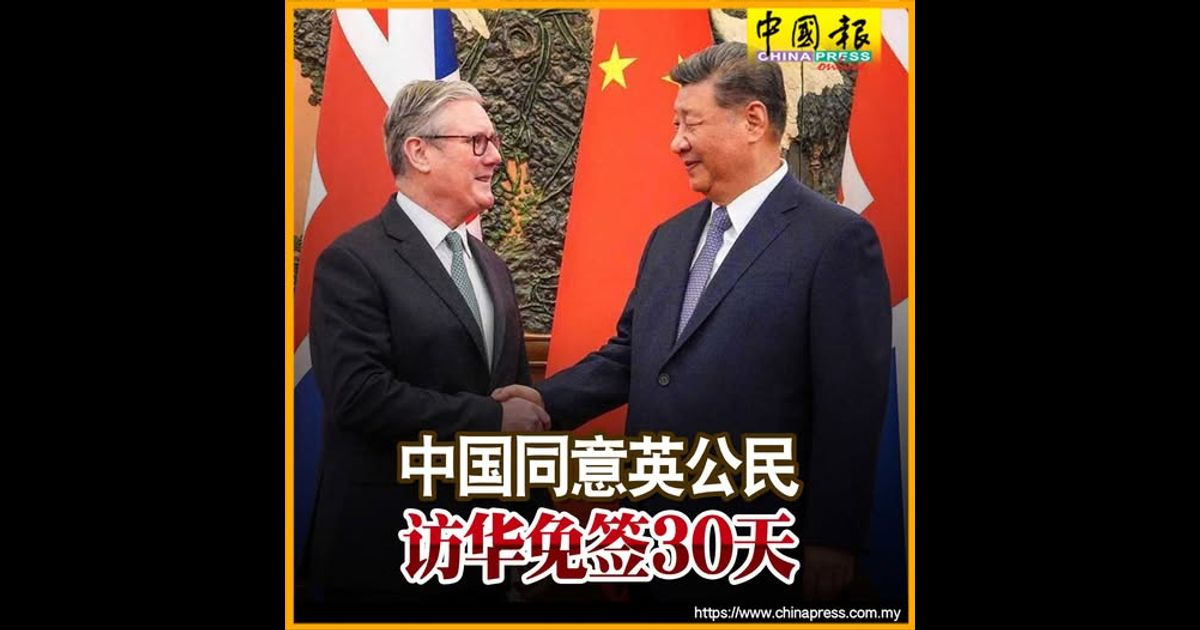 (北京30日综合电)中国国家主席习近平周四(29日)与到访的英国首相斯塔默会面时说,中国愿同英国发展长期稳定的全面战略伙伴关系,并提及对英实施单方面免签;斯塔默则呼吁建立“更加成熟”的中英关系。