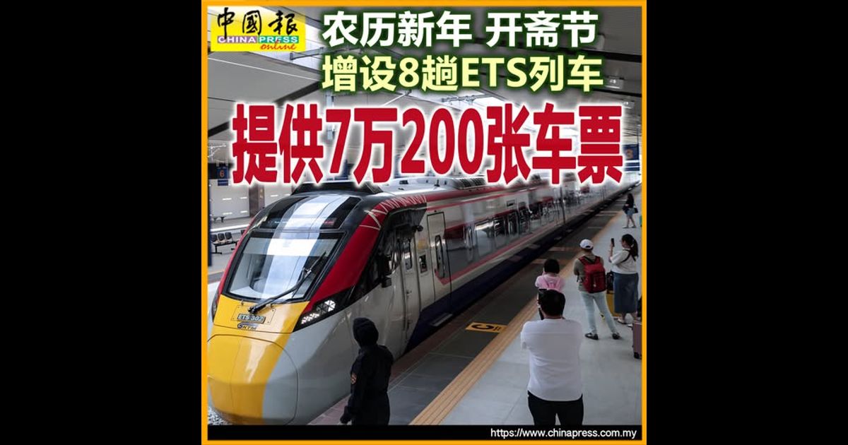 (吉隆坡30日讯)配合即将到来的农历新年与开斋节,马来亚铁道公司(KTMB)宣布,将在两个佳节期间,增设共计8趟双轨电动火车(ETS)服务,总数多达7万200张车票。