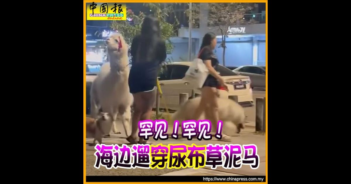 (槟城30日讯)3名男女牵着一只穿上尿布的草泥马(羊驼)及2只宠物狗在海边散步,原本画面聚焦在罕见的“溜草泥马”,不料其中一只宠物狗抬腿便溺,引发网民争议。 根据社媒广传时长约27秒的视频,一名羊驼饲主与2名分别牵着阿拉斯加犬及柯基犬的饲主,一同在卡巴星道悠闲散步,罕见的“溜羊驼”画面让不少网民直呼新鲜与可爱。