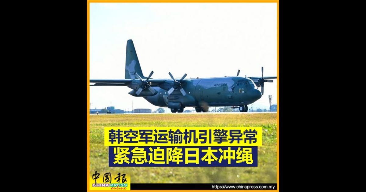 韩国空军表示,空军运输机C-130H原本于30日上午从金海基地起飞,准备飞往沙地阿拉伯参加国际防卫产业展览会,岂料却监测到其中一颗引擎发生异常,因此紧急于上午11时1分(大马时间上午10时1分)在日本冲绳县那霸基地紧急迫降,日本方面积极给予协助。