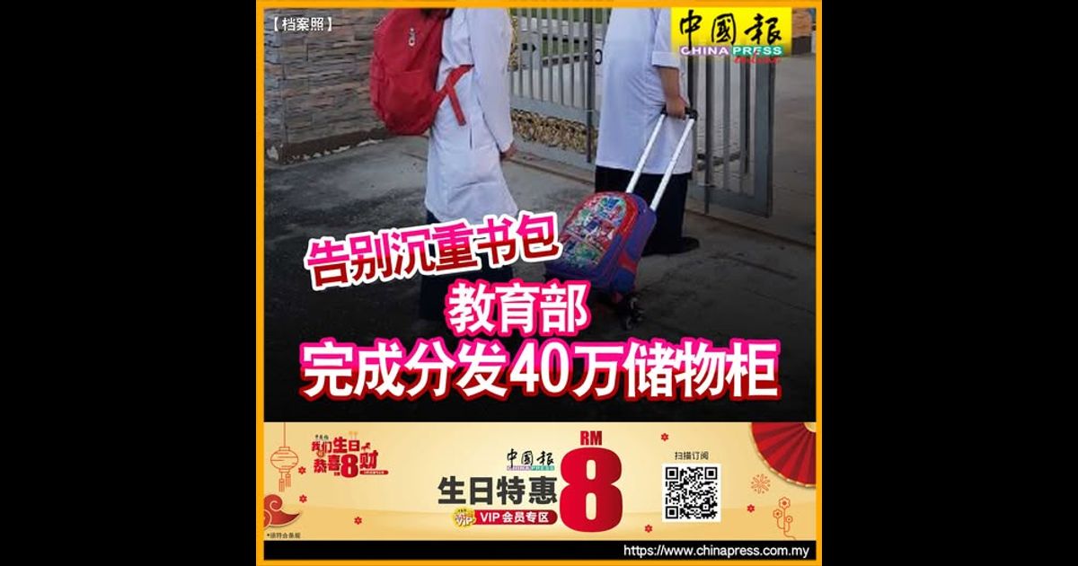 (吉隆坡1日讯)教育部指出,已全面完成全国小学储物柜分发计划,共向全国小学提供近40万个储物柜,以减轻学生书包过重的问题,提升学习环境的舒适度。