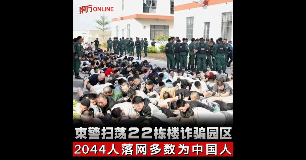 (金边1日讯)柬埔寨警方上周六(1月31日)在柴桢省巴域市展开大规模执法行动,突袭当地一处电信诈骗园区,共拘捕约2044名外籍嫌疑人,多数为中国籍人员,其中有5名是台湾人以及1名马来西亚人。