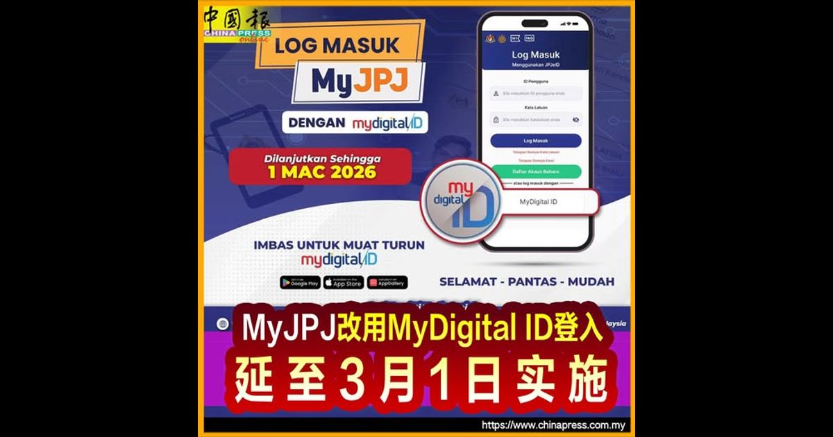 (吉隆坡3日讯)陆路交通局原定2月1日,落实通过国家数码身分认证(MyDigital ID)登入MyJPJ应用程式,唯该局宣布,已展延至3月1日。