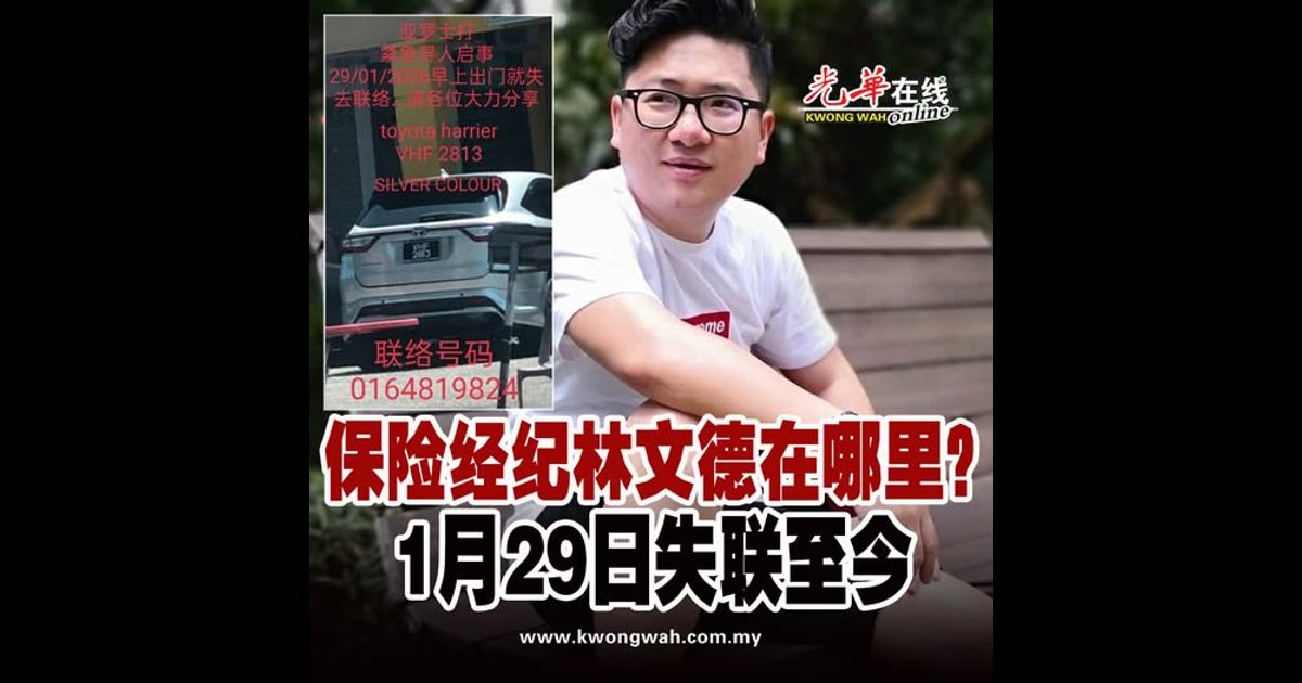 45岁华裔保险经纪林文德(Lim Boon Teik)自1月29日早上出门后失联,家属已向警方报案,希望社会各界人士留意并提供线索。