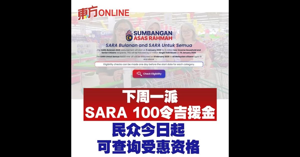(吉隆坡5日讯)财政部将于2月9日,派发慈悯基本关怀援助计划(SARA)的100令吉援助金,民众可从即日起前往 https://sara.gov.my 查询是否符合资格。