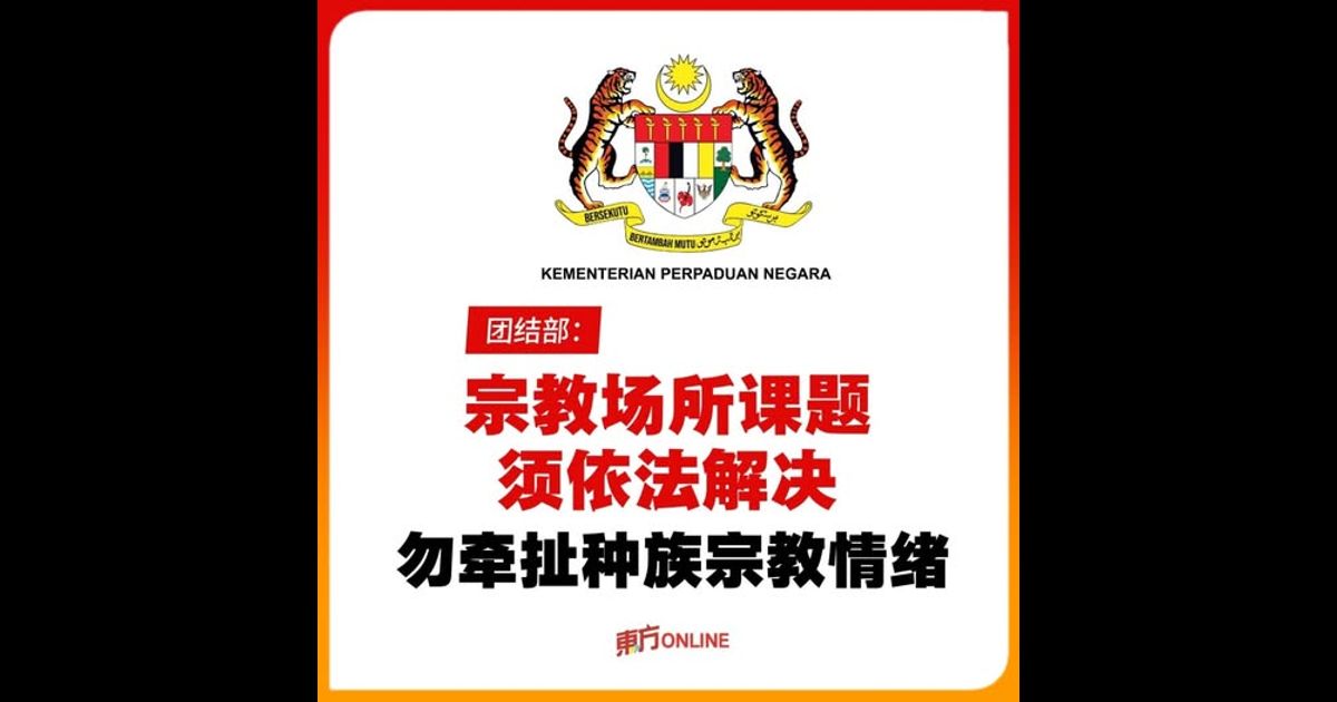团结部强调,任何涉及宗教场所的课题,皆须以审慎、客观及依法的方式处理,不应牵扯种族或宗教情绪,以免破坏社会和谐。