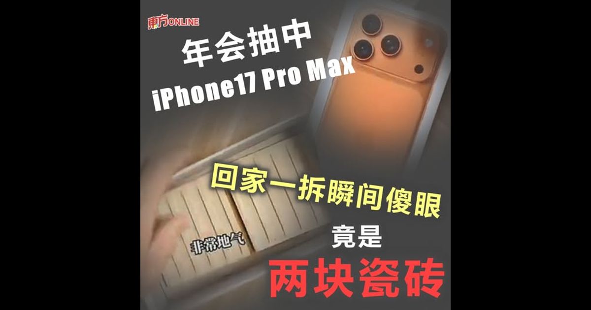 (北京8日讯)中国一名男子日前参加公司年会抽奖时,幸运抽中iPhone 17 Pro Max。男子为了与妻子一同分享这份好运,特地等回到家后才拆封礼盒,没想到包装一打开,映入眼帘的竟不是新手机,而是两块冰冷的瓷砖,瞬间让他从喜悦跌入错愕与愤怒之中。