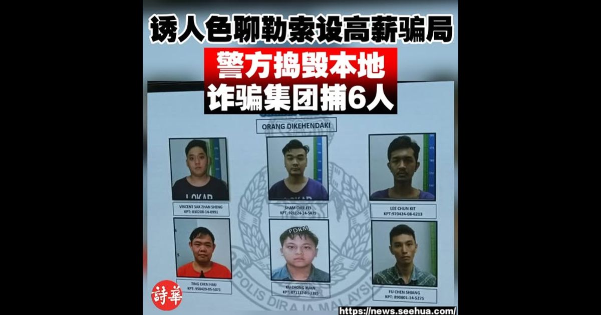 (吉隆坡10日讯)一本地诈骗集团不仅假冒女子诱导他人拍下色情视频勒索,还设下高薪骗局将本地人士诱骗至他国沦为猪仔,最终恶行遭警方侦破,6名犯罪成员也被逮捕。