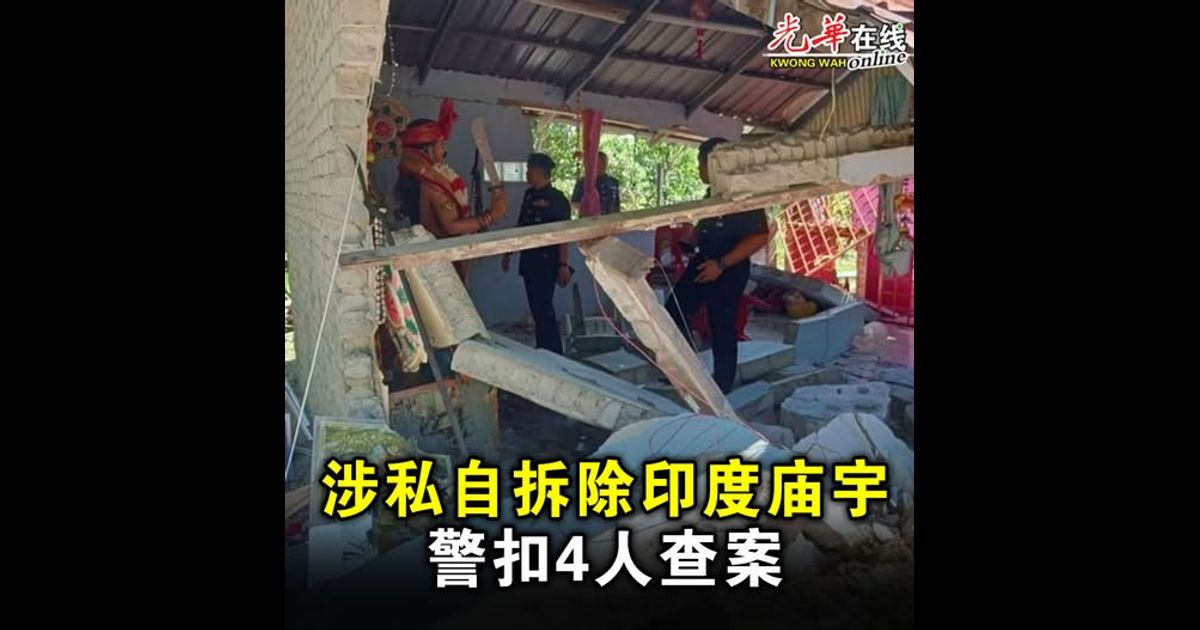 私自拆除一座被指非法的印度庙宇,警方已经扣留4人,并从破坏宗教场所和侮辱宗教等角度查案。
