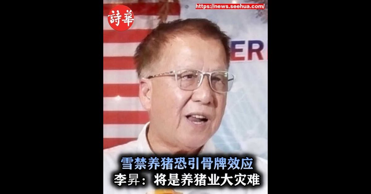 (怡保13日讯)人民进步党霹雳州主席拿督李昇表示,雪州禁止养猪开创先河,一旦引起其他州仿效,对养猪业者将是一项大灾难。