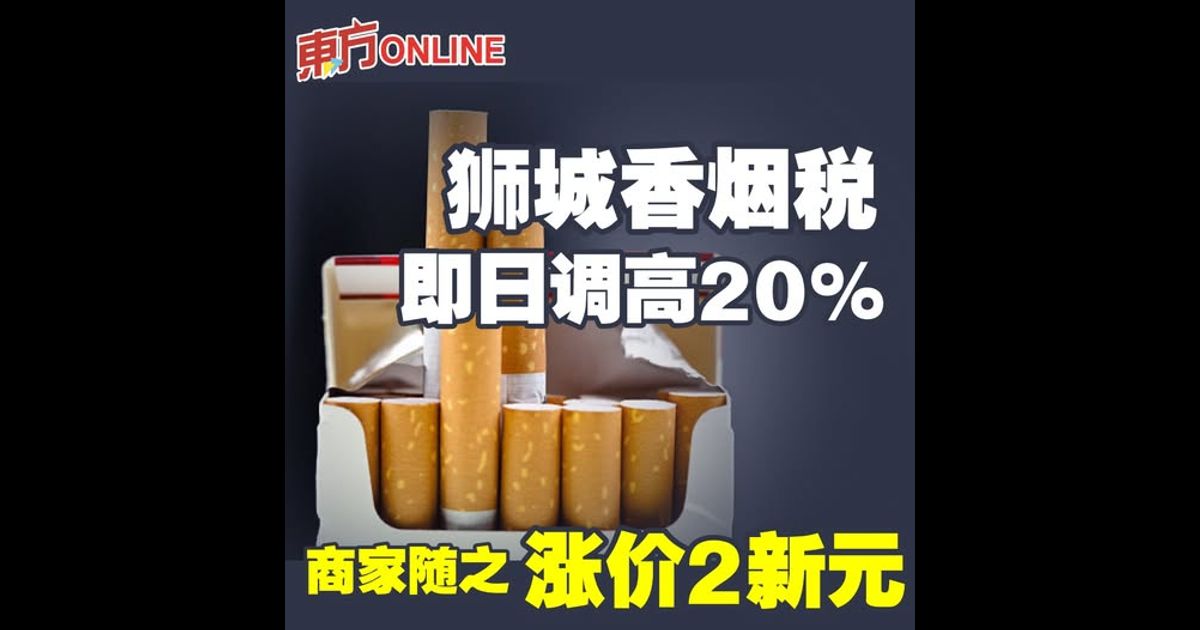 (新加坡13日讯) 为了进一步劝阻吸烟的恶习,新加坡总理兼财政部长黄循财宣布,所有烟草产品的草税从周四(12日)起提高20%,意味著每包香烟的税收增加近2新元(约6令吉18仙)。有商家当天立刻起价,一包香烟售价上涨约2新元。